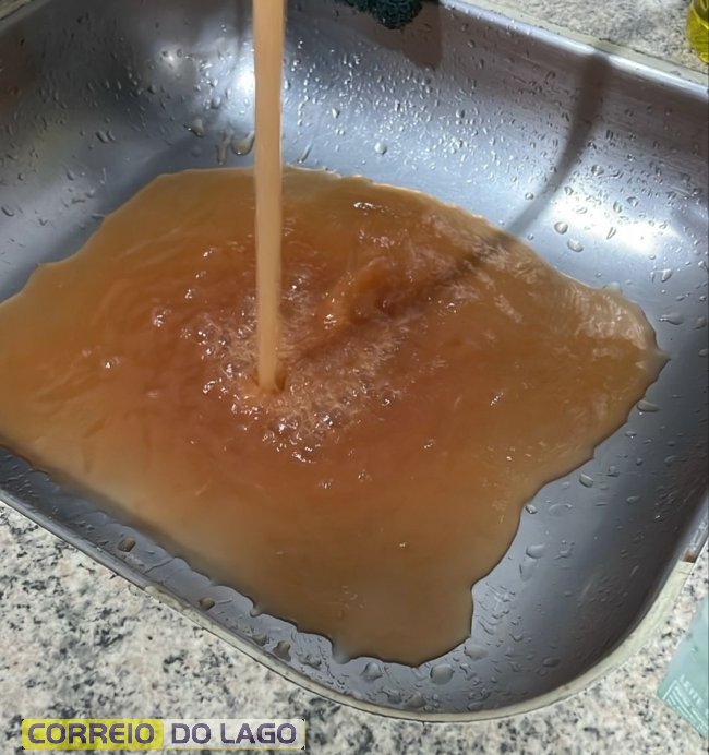 Vídeos e fotos enviados à redação mostram água com coloração marrom saindo da torneira de uma residência, indicando a presença de impurezas. Segundo os moradores, o problema persiste desde o final da tarde e tem dificultado atividades básicas, como higiene pessoal, preparo de alimentos e limpeza doméstica.