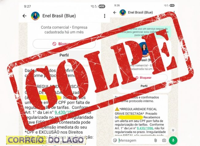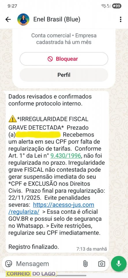 Alerta de golpe: tentativa de fraude no whatsApp usa nome da Enel e ameaça fiscal contra santa-helenense