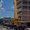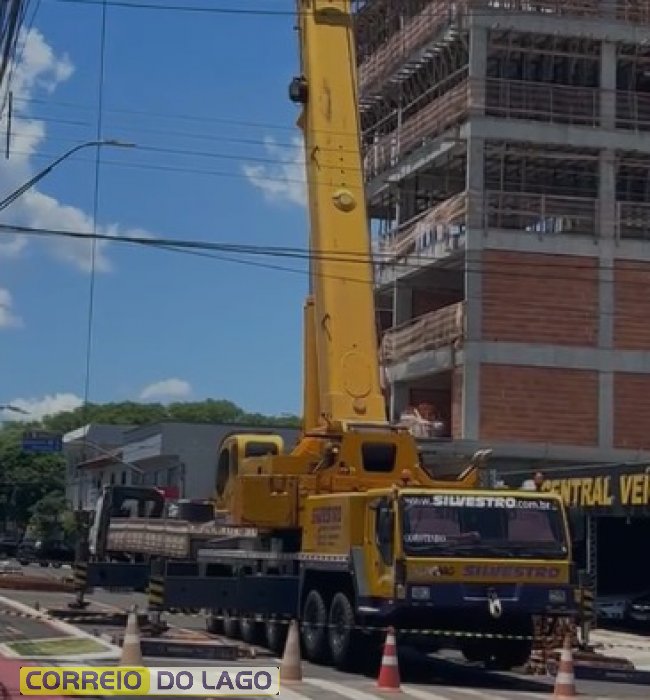 O bloqueio ocorre na altura da Farmácia Real, onde uma grua de grande porte está paralisando o fluxo de veículos. A interdição afeta diretamente o sentido da avenida que leva ao Balneário Terra das Águas.