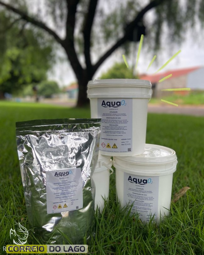 O oxigênio em pó, chamado AQUA O₂, é indicado para uso preventivo e emergencial, ajudando a fornecer oxigênio, oxidar amônia e equilibrar o pH da água.