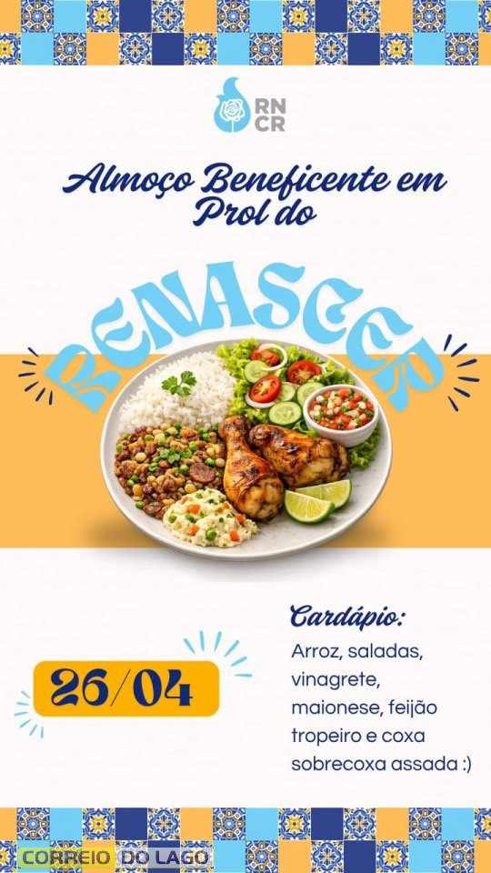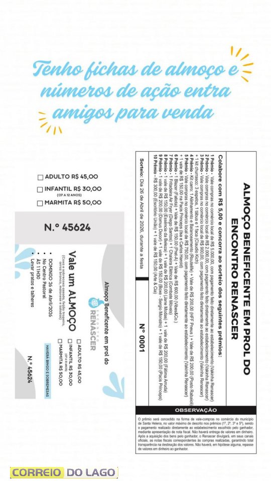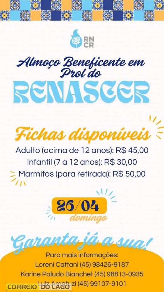 O Grupo Renascer, movimento da Igreja Católica presente em Santa Helena, realiza no próximo dia 26 de abril, domingo, um almoço beneficente com o objetivo de arrecadar recursos para seus encontros espirituais ao longo do ano. A programação começa a partir das 11h30 e promete reunir famílias, amigos e toda a comunidade em um momento de convivência e fé.