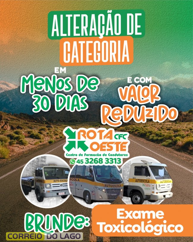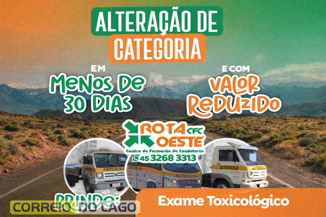 O CFC Rota Oeste, em Santa Helena, disponibiliza condição especial para quem deseja realizar a alteração de categoria. O processo pode ser finalizado em menos de 30 dias, respeitando os prazos legais, com valor reduzido.
