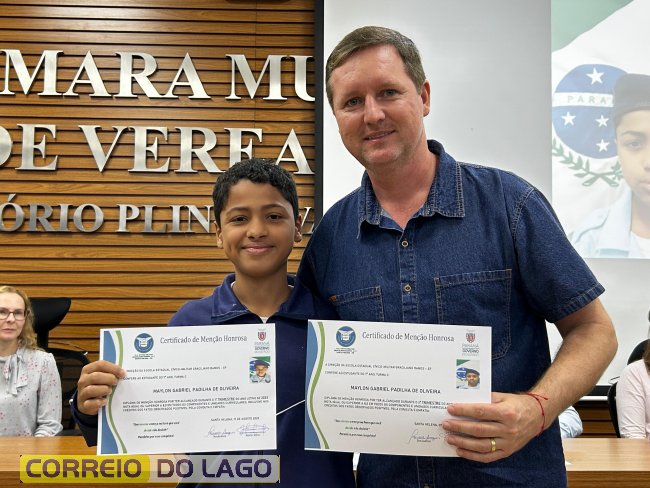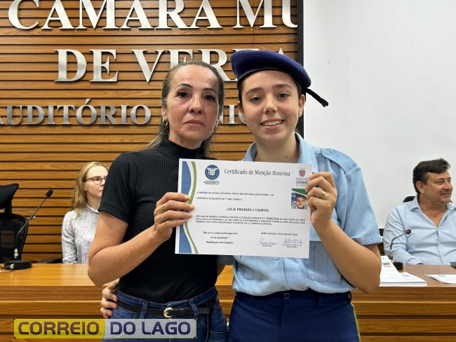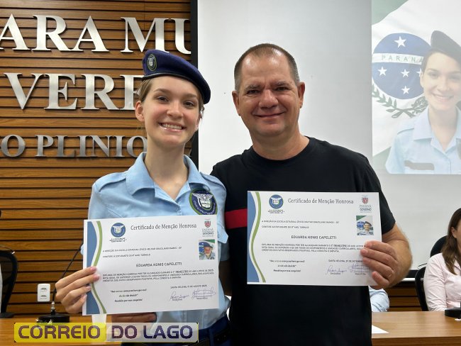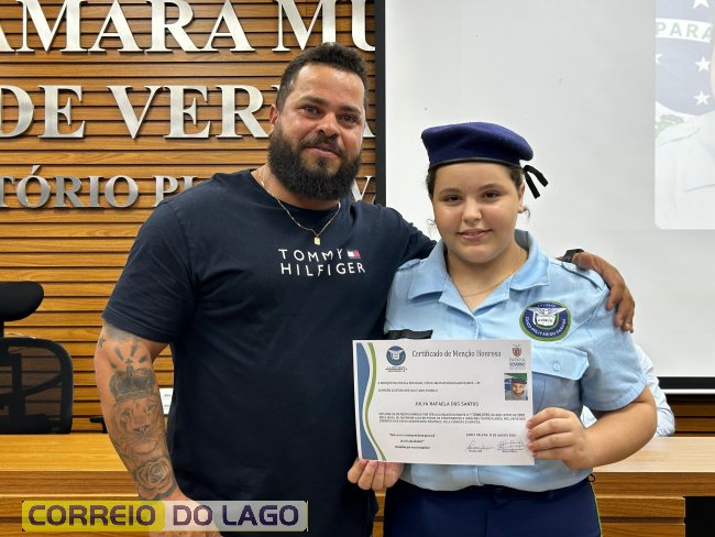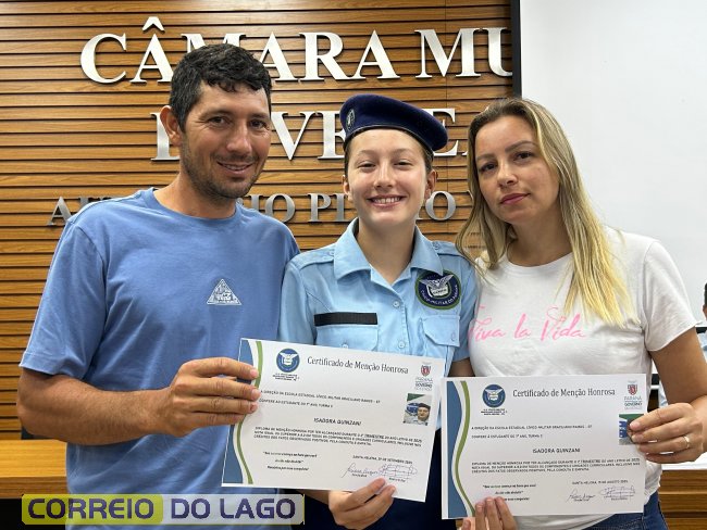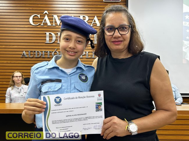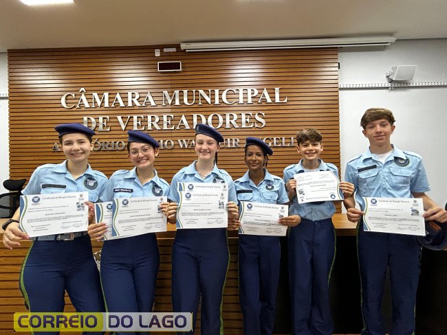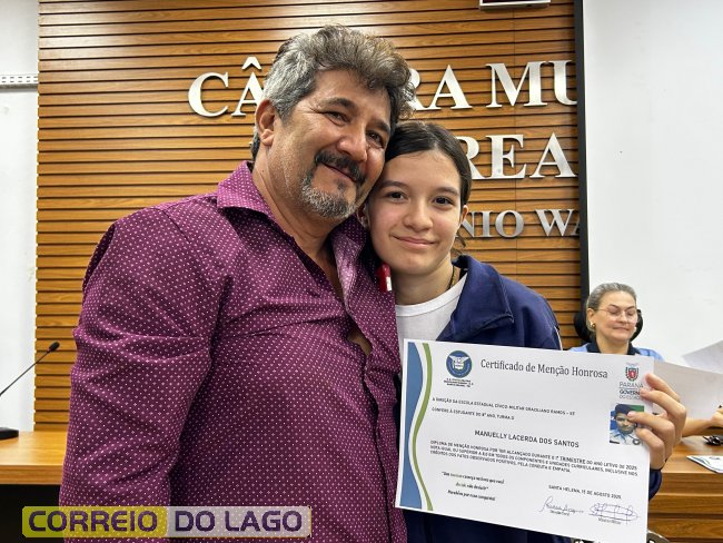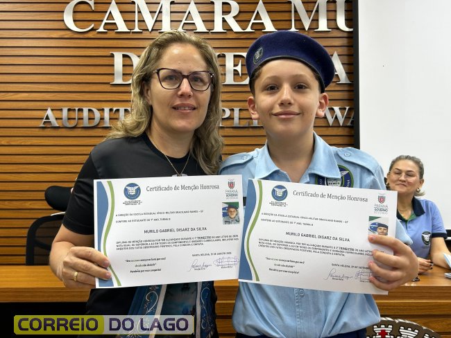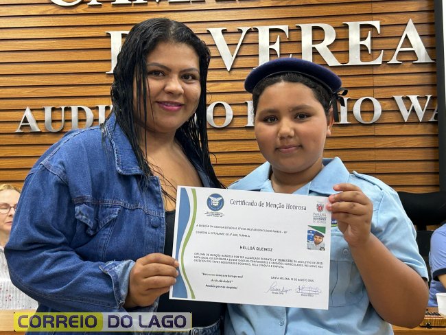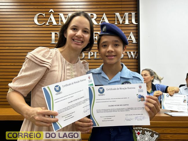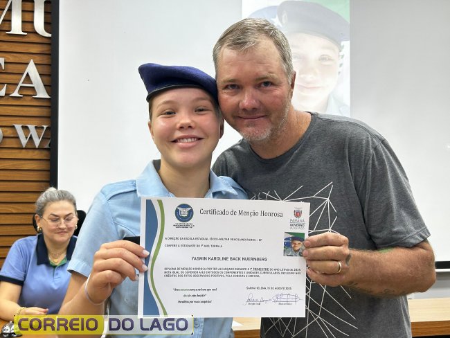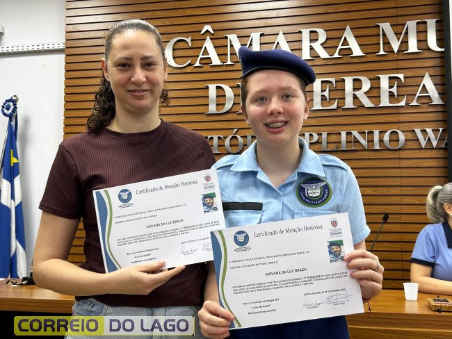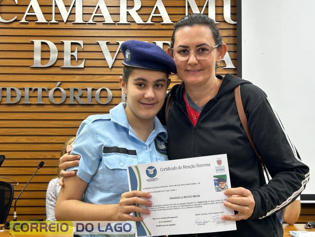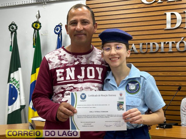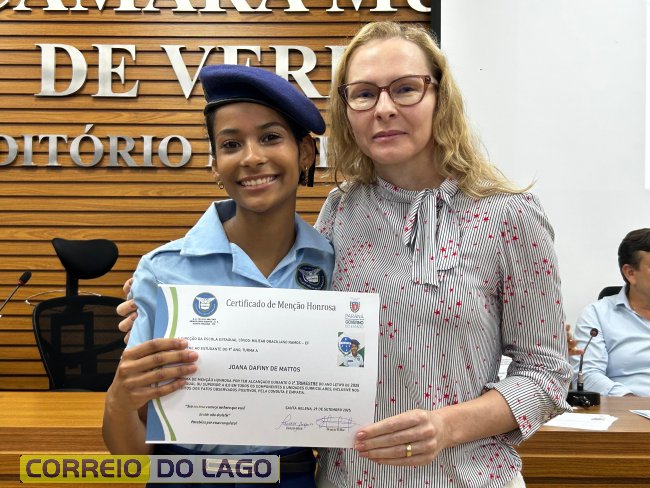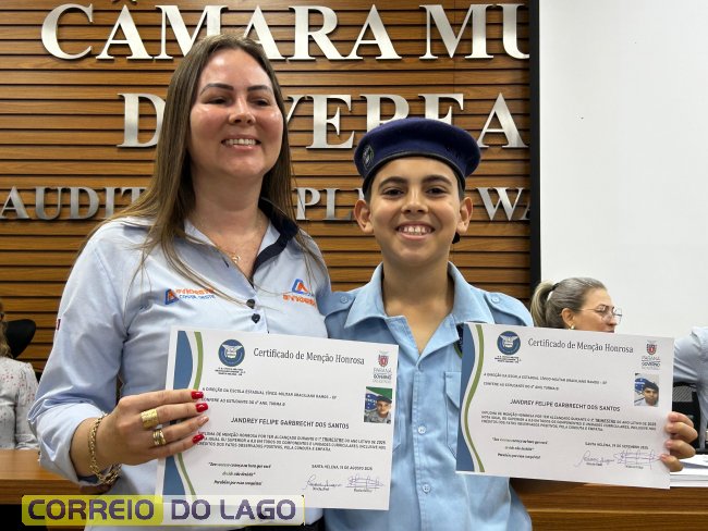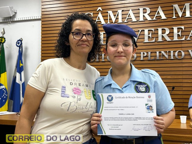 Na manhã desta quarta-feira (01), a Câmara de Vereadores de Santa Helena foi palco de uma solenidade especial da Escola Estadual Cívico-Militar Graciliano Ramos. Durante o evento, alunos que se destacaram nos dois primeiros trimestres receberam certificados de regularidade em suas notas, além de menções honrosas por atitudes exemplares.