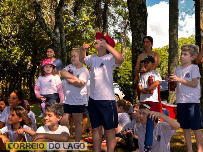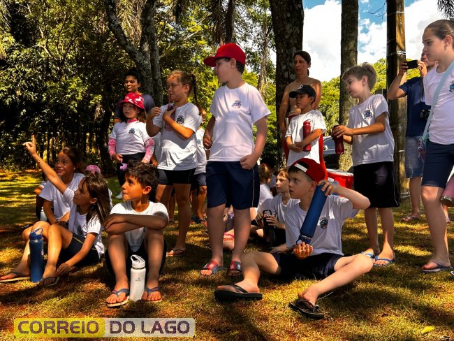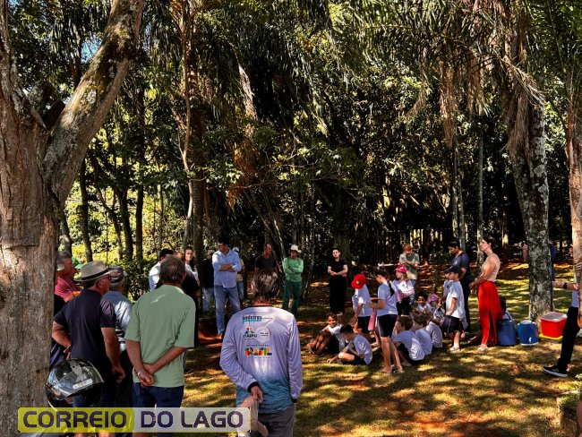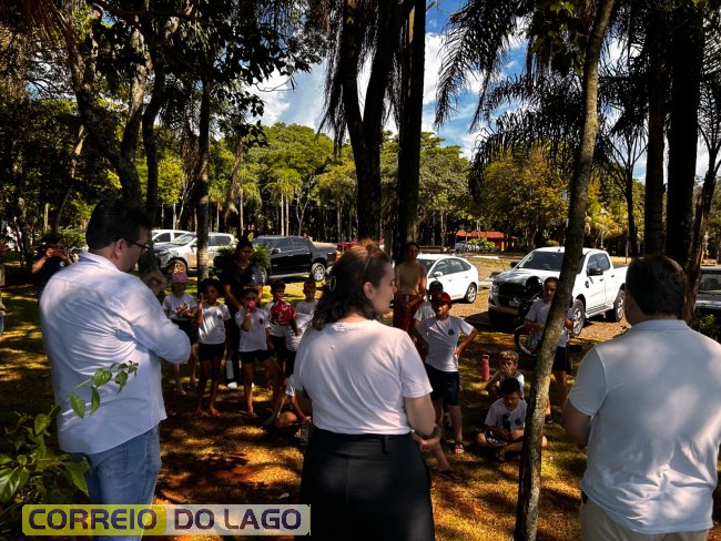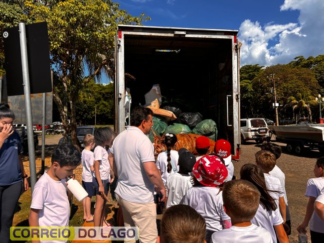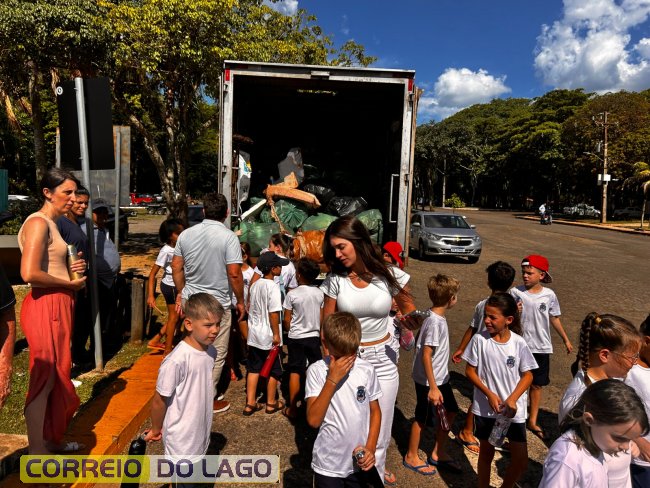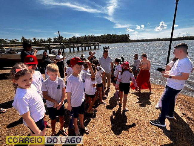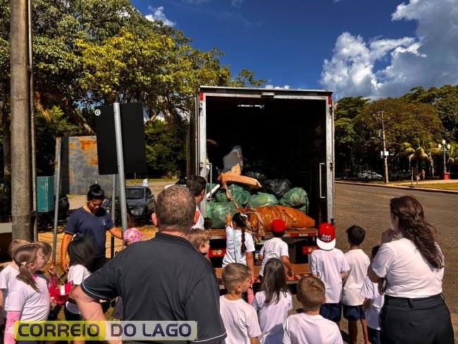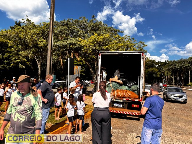 Nesta sexta-feira (05), para consolidar o aprendizado de forma prática, alunos da Escola Municipal Professora Inês Mocellin puderam observar de perto a equipe da coleta seletiva carregar o material coletado pelos pescadores às margens do lago.