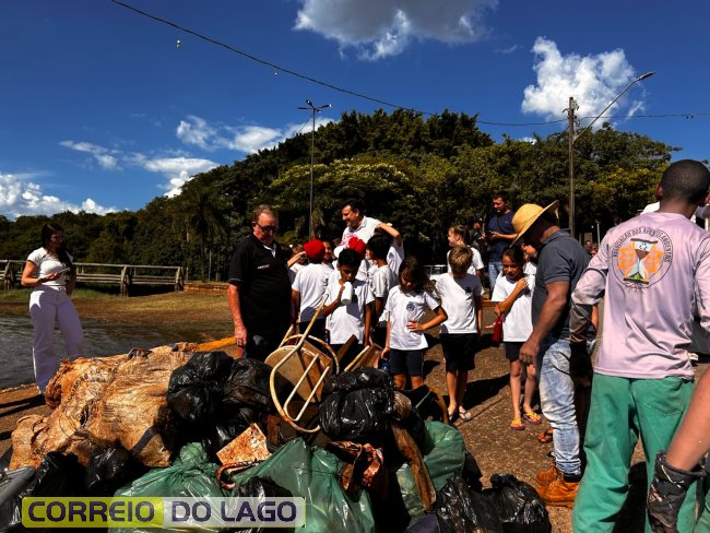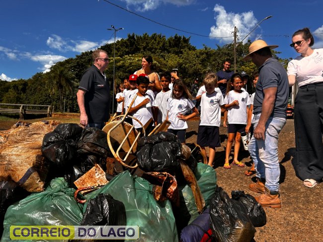 Alunos de Santa Helena participam de ação de conscientização durante limpeza do lago realizada pela colônia de pescadores e prefeitura