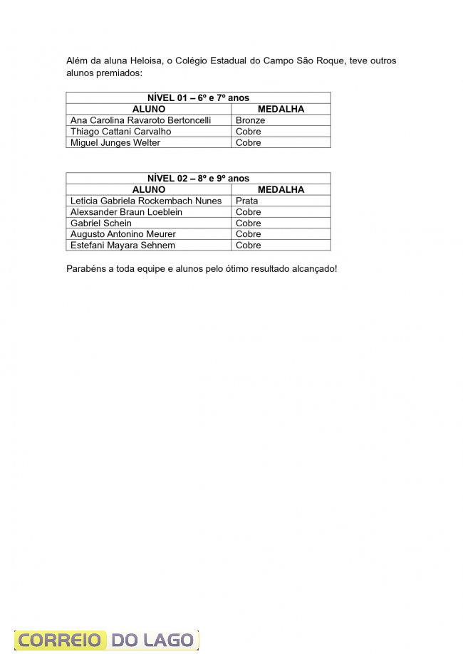 Além de Heloísa, outros alunos da escola também foram premiados: Ana Carolina Ravaroto Bertoncelli (bronze), Thiago Cattani Carvalho (cobre), Miguel Junges Welter (cobre), Leticia Gabriela Rockembach Nunes (prata), Alexsander Braun Loeblein (cobre), Gabriel Schein (cobre), Augusto Antonino Meurer (cobre) e Estefani Mayara Sehnem (cobre). O resultado reflete o esforço dos alunos, a dedicação dos professores Loreni Foletto e Elton José Schaefer, e o apoio das famílias.