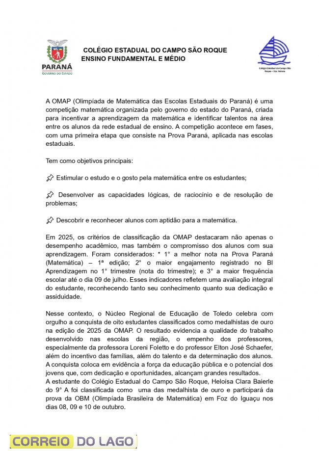 A estudante Heloísa Clara Baierle, do 9° ano A do Colégio Estadual do Campo São Roque, em Santa Helena, conquistou a medalha de ouro na OMAP 2025 (Olimpíada de Matemática das Escolas Estaduais do Paraná). Com a vitória, Heloísa garantiu participação na Olimpíada Brasileira de Matemática (OBM), que será realizada em Foz do Iguaçu nos dias 8, 9 e 10 de outubro.