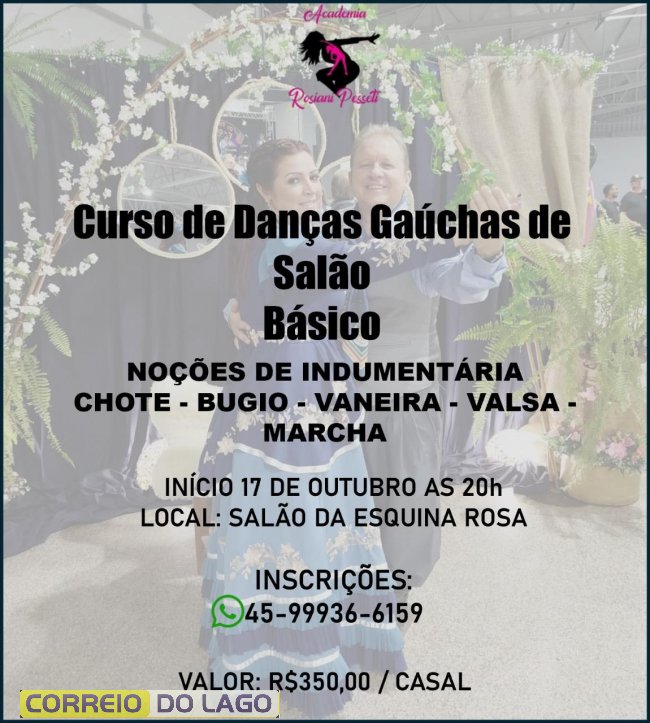 A partir do dia 17 de outubro, às 20h, inicia o curso básico de danças gaúchas de salão, com noções de indumentária. Os participantes aprenderão chote, bugio, vaneira, valsa e marcha em aulas práticas voltadas para casais.