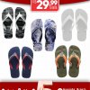 Entre os destaques estão as Havaianas para adulto feminino, a partir de R$ 19,99, e para adulto masculino, a partir de R$ 29,99; para infantil, tanto feminino quanto masculino, a partir de R$ 24,99, e a linha TOP por R$ 20,99. Além disso, barbantes podem ser adquiridos a partir de R$ 15,99, oferecendo variedade e economia.