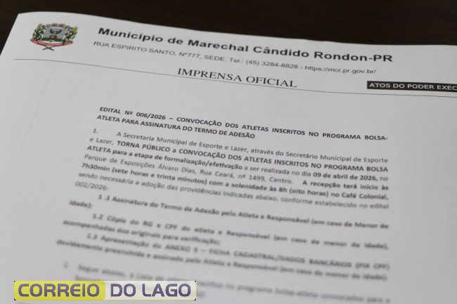 A prefeitura de Marechal Cândido Rondon, por meio da Secretaria de Esporte e Lazer, informa que a assinatura dos termos de adesão dos esportistas classificados no programa Bolsa-Atleta 2026 será realizada nesta quinta-feira (9), a partir das 7h30, no Café Colonial, localizado no parque de exposições.