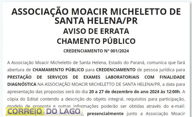 A Associação Moacir Micheletto fez abertura de chamamento público para credenciamento de pessoa jurídica para prestação de serviços de exames laboratoriais com finalidade diagnóstica no hospital beneficente Moacir Micheletto, de Santa Helena.