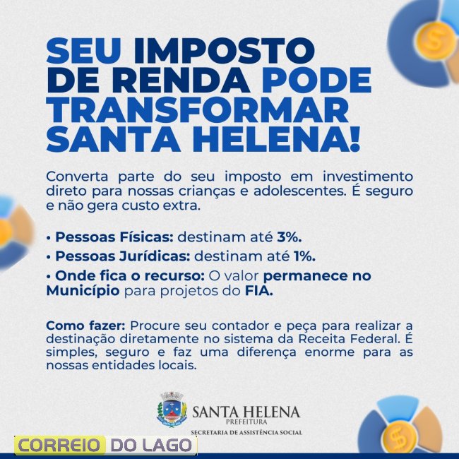 As pessoas físicas podem destinar até 3% do imposto devido, enquanto empresas podem contribuir com até 1%. O processo deve ser realizado no momento da declaração do Imposto de Renda, com a orientação dos contadores, que atuam como parceiros na campanha. A mobilização segue durante o período de entrega das declarações, e a expectativa é ampliar a participação da comunidade, fortalecendo os investimentos no futuro das crianças e dos adolescentes de Santa Helena.