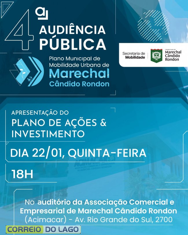 A prefeitura de Marechal Cândido Rondon, por meio da Secretaria de Mobilidade, realizará no dia 22 de janeiro a 4ª audiência pública do Plano Municipal de Mobilidade Urbana. O encontro terá como foco a apresentação do plano de ações e Investimentos do município.
