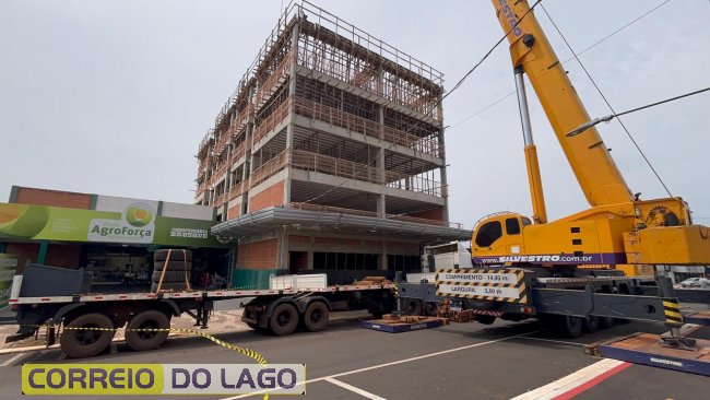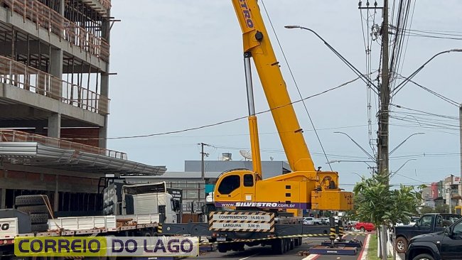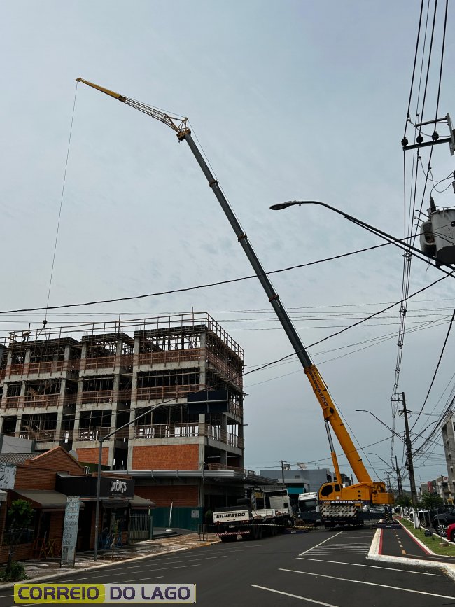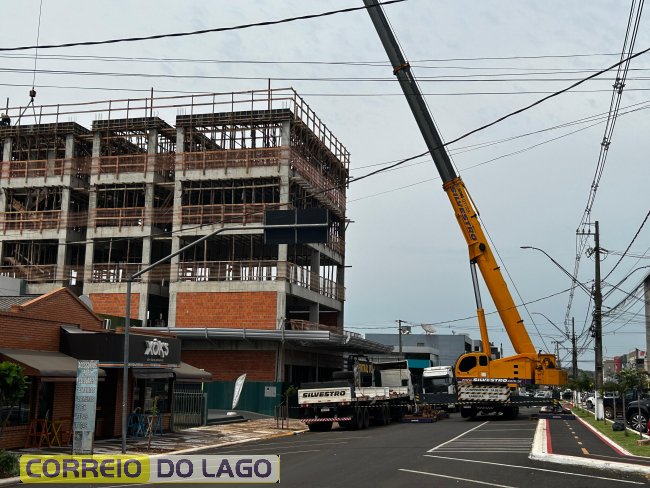 O bloqueio, que acontece em frente ao Fórum Municipal, é fundamental para garantir a segurança durante a operação de um guindaste de grande porte (grua) em uma obra de construção civil na cidade.
