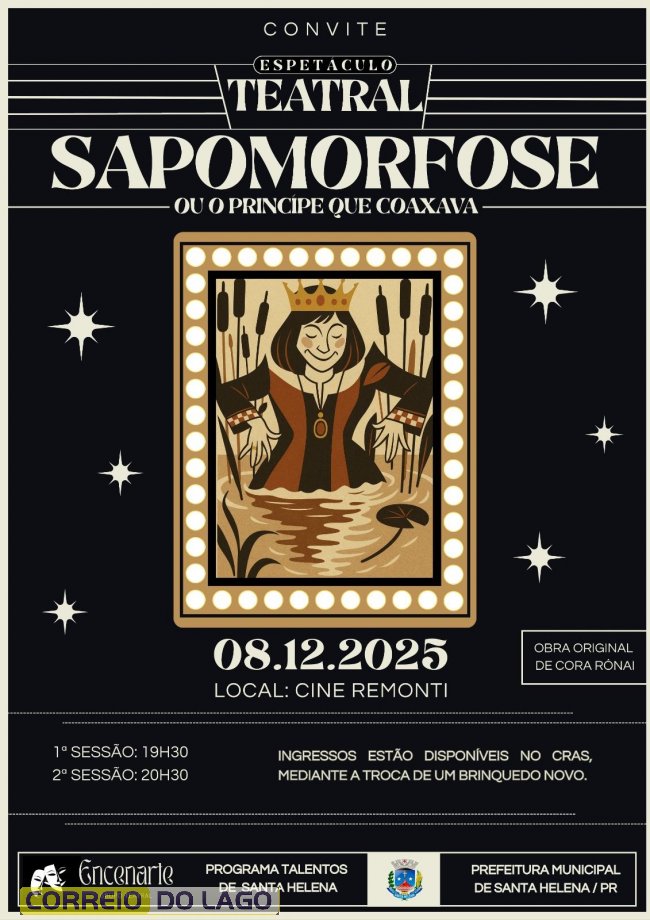 Prepare-se para uma noite de risadas e surpresas! O Departamento de Cultura de Santa Helena convida o público para prestigiar o espetáculo teatral "Sapomorfose ou o Príncipe que Coaxava", uma divertida adaptação da obra original da renomada escritora Cora Rónai, com ilustrações de Millôr Fernandes, que promete virar os contos de fadas de cabeça para baixo.