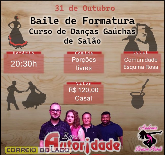 A Academia Rosiani Pesseti, em parceria com a Comunidade Esquina Rosa, em Santa Helena, realiza nesta sexta-feira (31) o Baile de Formatura do Curso de Danças Gaúchas de Salão, com início às 20h30. O evento celebra o encerramento de mais uma turma e promete uma noite repleta de alegria, integração e boa música.