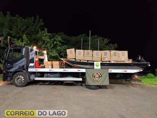 Durante patrulhamento, os policiais visualizaram uma embarcação vinda do Paraguai, carregada com cigarros contrabandeados, que se deslocava em direção à margem brasileira. Ao notar a presença da equipe policial, o condutor jogou a embarcação na margem do lago e fugiu em meio à mata, não sendo localizado.