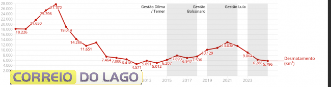 As taxas na Amazônia vinham crescendo desde 2015, mas tiveram um salto chegando a 13 mil km² em 2021. O índice só voltou a cair no último ano do governo de Jair Bolsonaro, em 2022, com a marca de 11.594 km².