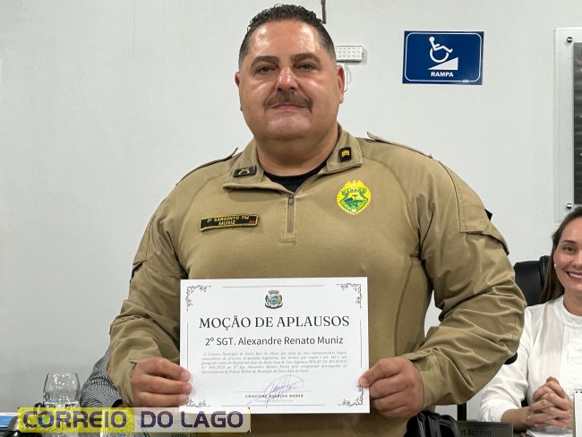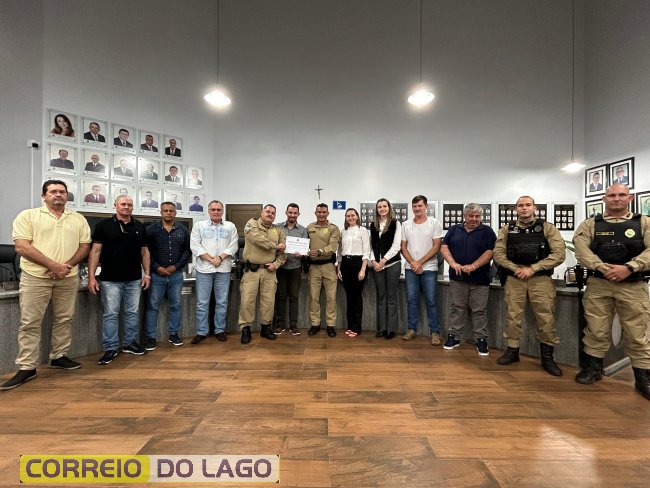A Câmara de Vereadores de Entre Rios do Oeste e o 19º Batalhão de Polícia de Militar do Paraná concedeu, na noite desta segunda-feira (12), uma Moção de Aplauso ao 2º Sargento Alexandre Renato Muniz, em reconhecimento ao trabalho realizado durante seu período à frente do destacamento local da Polícia Militar do Paraná.