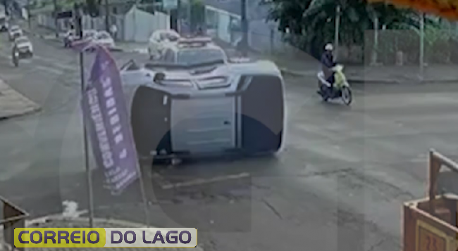 As imagens mostram o momento em que a viatura seguia pela Rua Vitória e colide contra a caminhonete que seguia pela Rua Souza Naves. Com o impacto da batida, a caminhonete tomba ficando de lado.