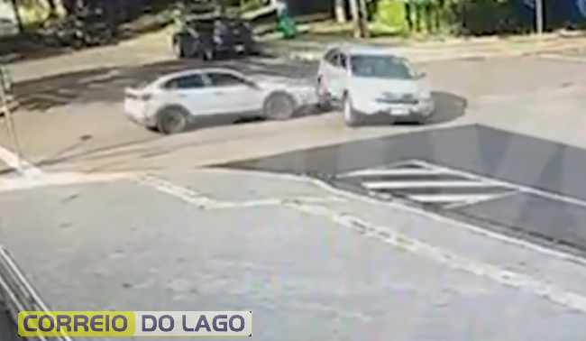 Nas imagens flagradas por câmera de segurança é possível ver que um dos carros seguia na rua Patrulheiro Venanti Otremba que é via preferencia, quando é atingido pelo outro automóvel que seguia na rua Rui Barbosa.