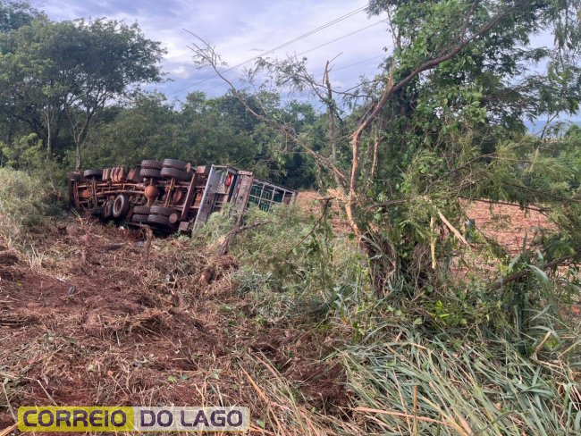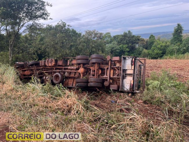 Na manhã desta terça-feira (17), por volta das 07h15, um caminhão carregado com frangos saiu da pista e tombou na rodovia PR-488, nas proximidades do município de Diamante do Oeste.