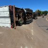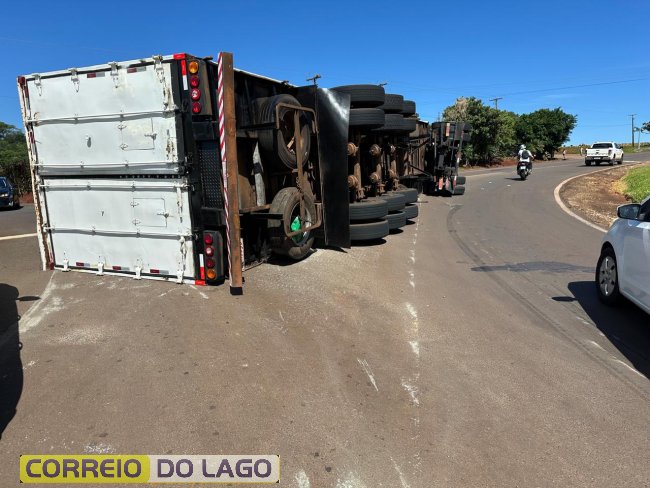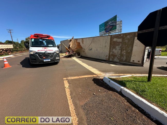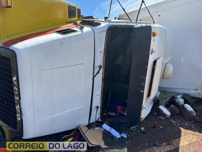Um acidente foi registrado na tarde desta terça-feira (21) no trevo de acesso a Itaipulândia, na PR-497. Por volta das 15h, um caminhão que havia acabado de carregar em uma empresa no distrito de Caramuru, em Itaipulândia, seguia com destino a Cascavel quando o motorista perdeu o controle da direção, resultando no tombamento do veículo próximo ao trevo de entrada da cidade.