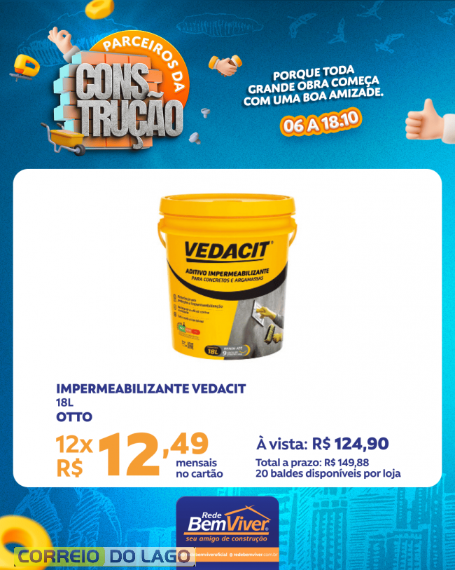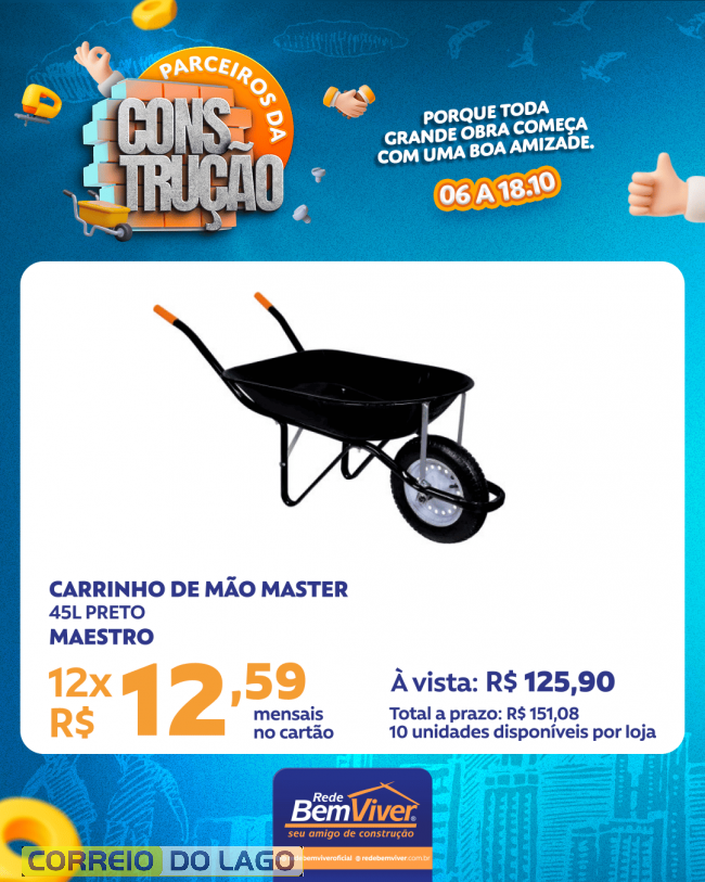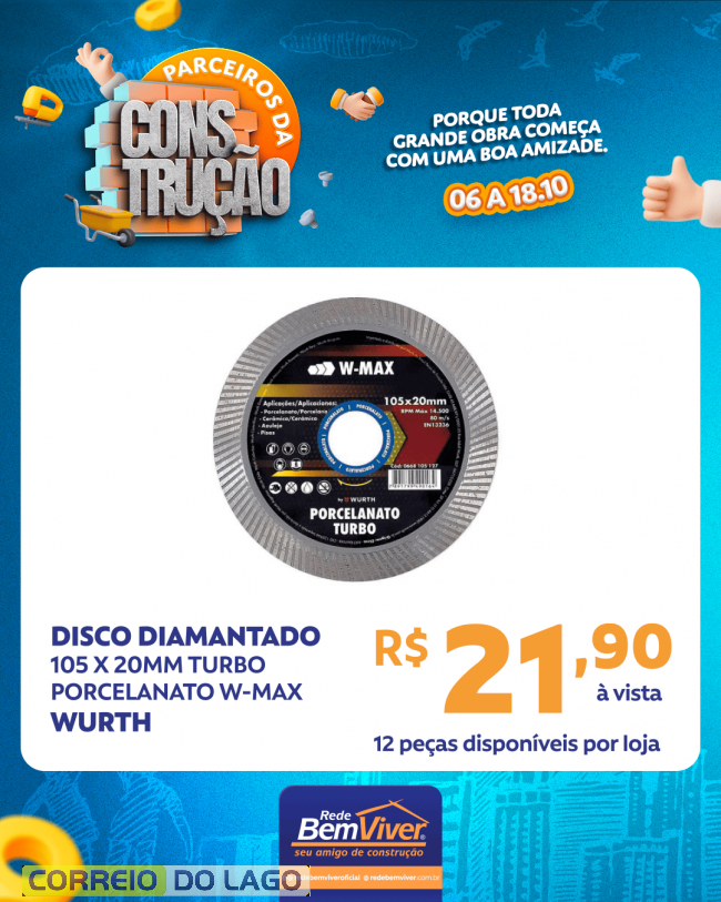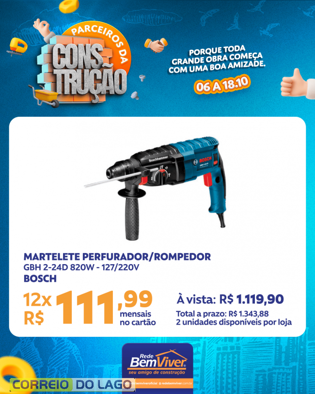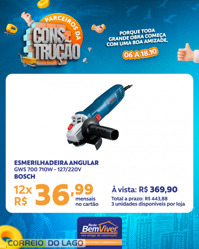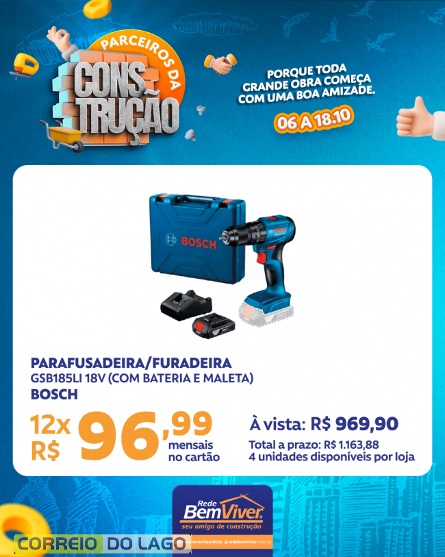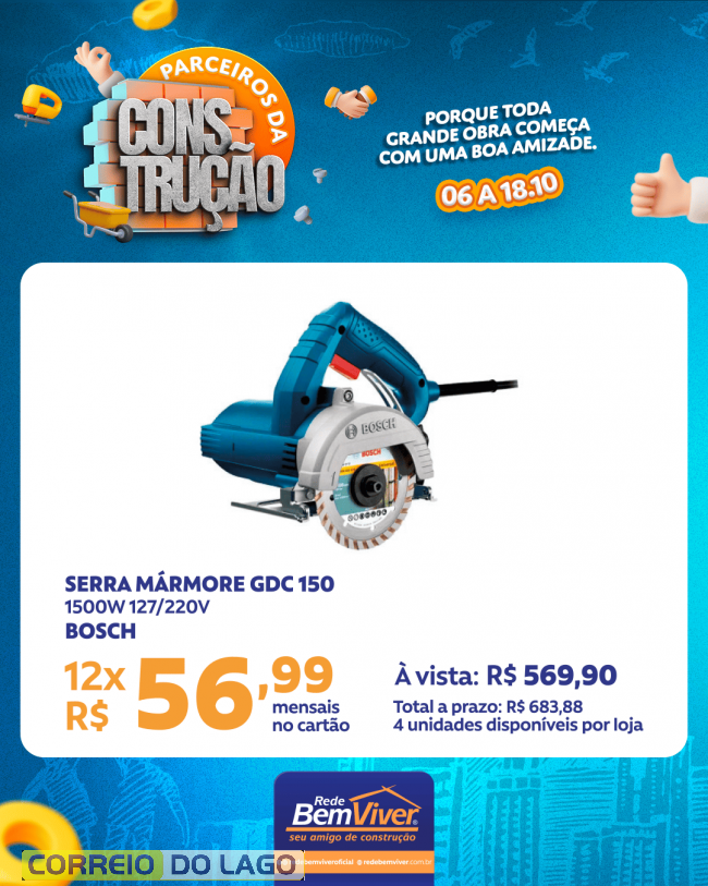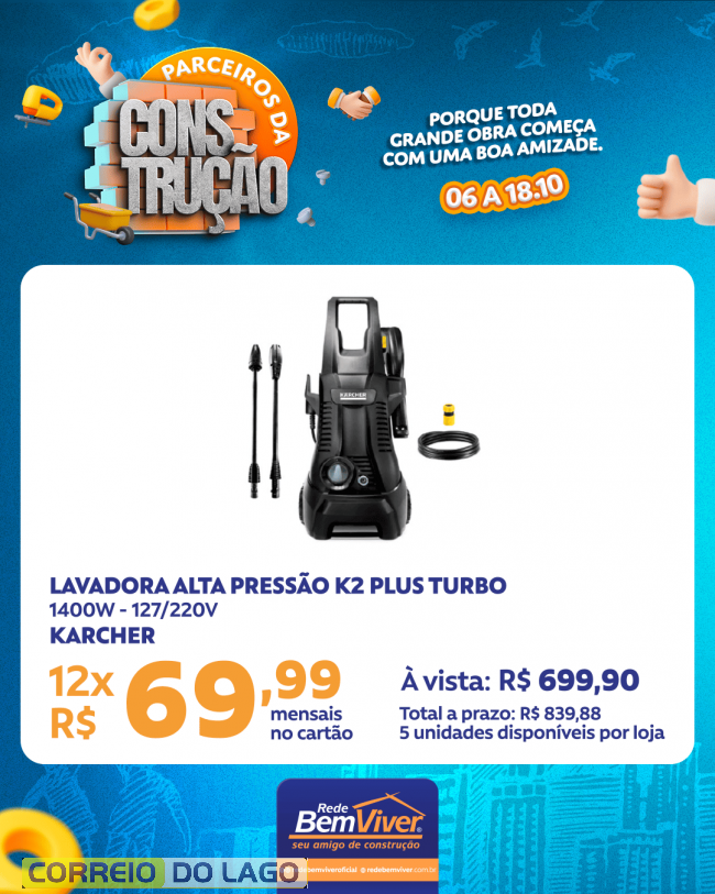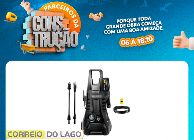 Entre os destaques estão o carrinho de mão Master 45L, o impermeabilizante Vedacit 18L, o porcelanato acetinado retificado 72x72cm e ferramentas elétricas Bosch, como esmerilhadeira, serra mármore e parafusadeira com bateria e maleta. A campanha também inclui a lavadora de alta pressão Karcher K2 Plus Turbo, com desconto exclusivo, entre outras ofertas.