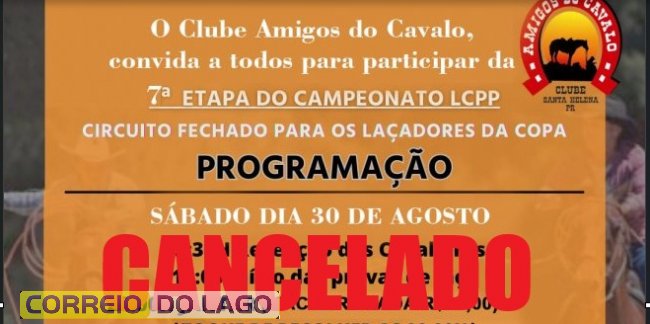 A organização do Clube Amigos do Cavalo de Santa Helena anunciou o cancelamento da 7ª etapa do Campeonato LCPP – Circuito Fechado para Laçadores da Copa, que estava prevista para os dias 30 e 31 de agosto.