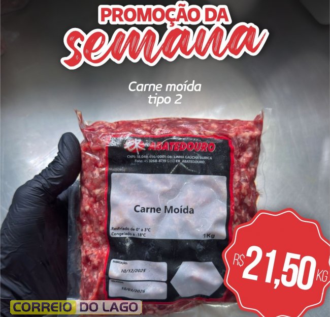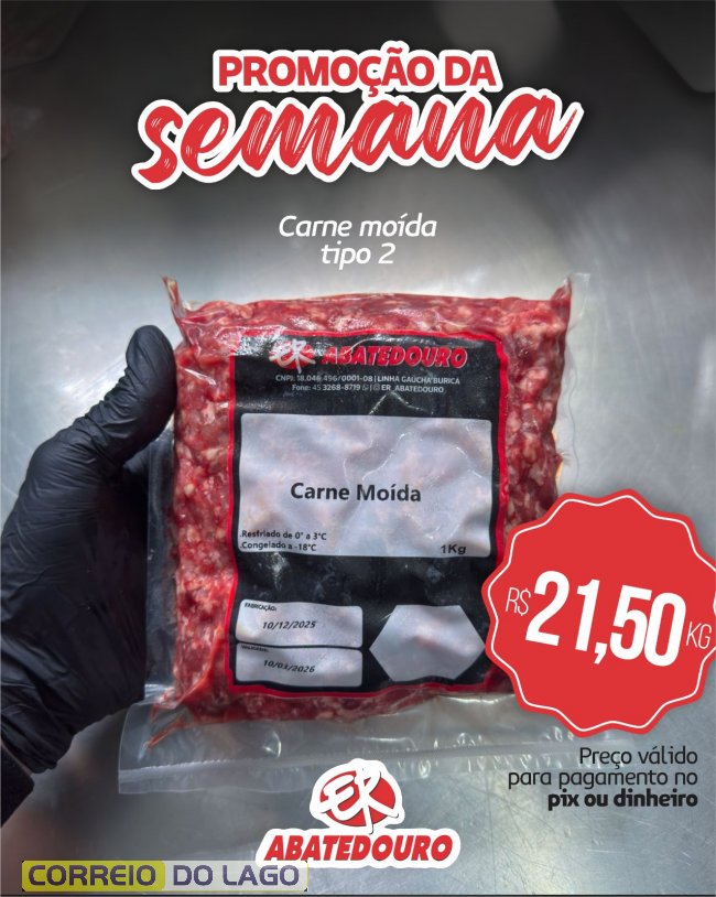 O ER Abatedouro, na Linha Gaúcha Buricá, está com promoção especial nesta semana: carne moída tipo 2 por apenas R$ 21,50 o quilo, preço válido para pagamento em pix ou dinheiro.