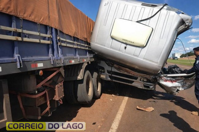 Um dos caminhões, com placas Mercosul, colidiu violentamente na traseira de outro veículo de carga, com placas do Paraguai.
