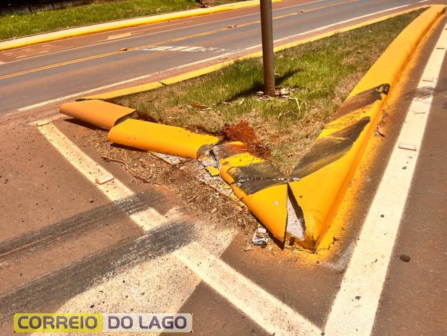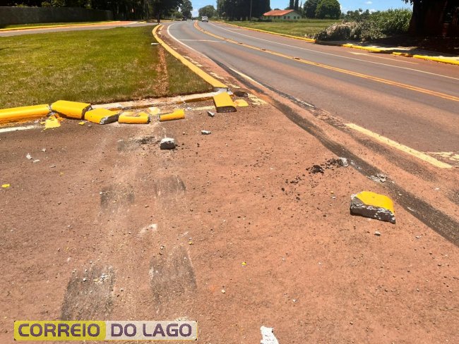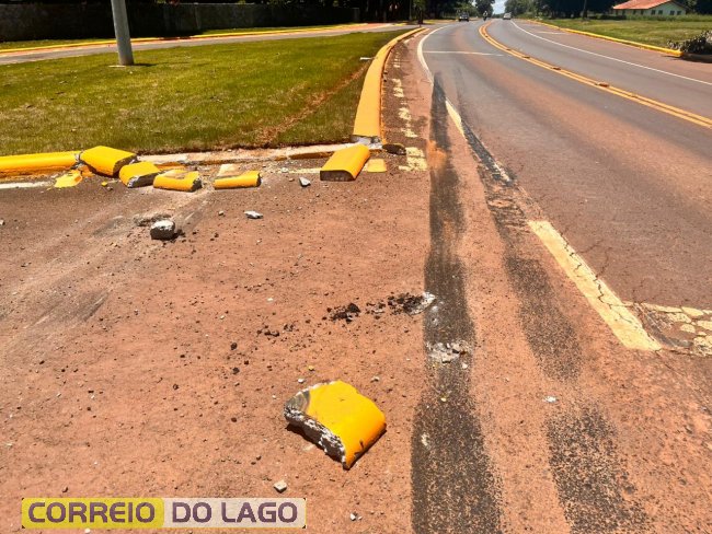 Com o impacto, alguns meios-fios foram quebrados e marcas de frenagem ficaram visíveis na pista, indicando uma tentativa de evitar um dano maior.