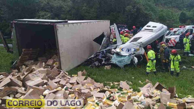 Seis pessoas morreram após carreta tombar sobre uma van na BR-116, em Campina Grande do Sul, na Região Metropolitana de Curitiba. O grave acidente foi registrado por volta das 3h45 da madrugada desta segunda-feira (05), no km 4 da rodovia.