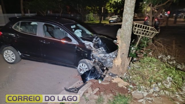 Um carro bateu em árvore e em lixeira após a motorista perder o controle da direção na Rua Maringá, no bairro Jardim La Salle, em Toledo, na noite de sábado (08).
