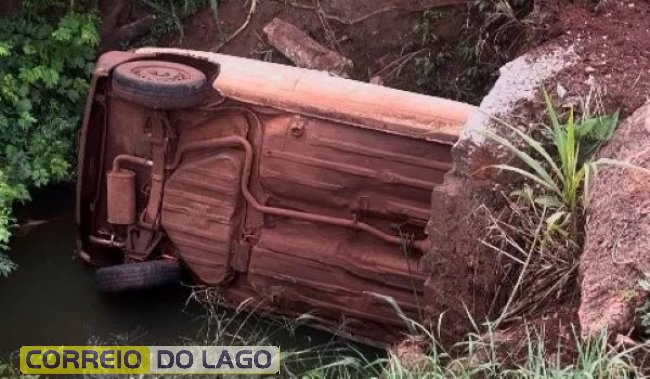 Um veículo VW Gol perdeu o controle e acabou saindo da estrada, caindo em um córrego às margens da via.