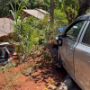 Automóvel desceu barranco e atingiu muro de imóvel no bairro Cancelli em Cascavel, no Oeste do Paraná, no início da tarde de quinta-feira (08). A batida aconteceu no cruzamento das ruas Manoel Ribas com Belém.