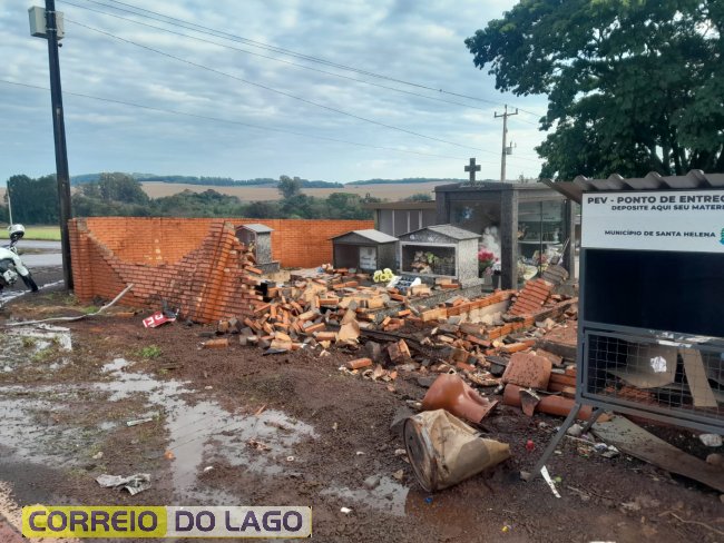Carro sai da pista e destrói muro do cemitério de São Clemente, em Santa Helena