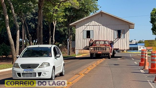 Casa é transportada de caminhão até o distrito de São Roque em Santa Helena com escolta da Polícia Rodoviária