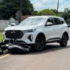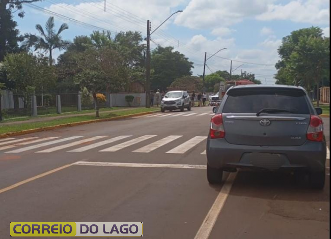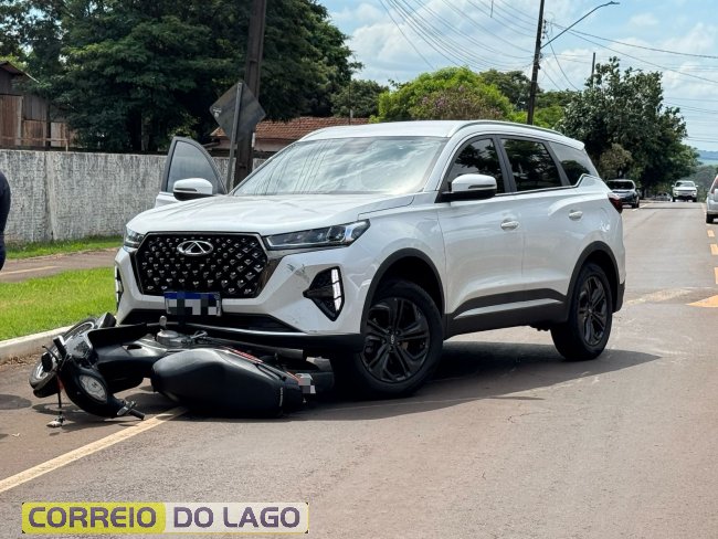 Na manhã desta quinta-feira (25), um acidente de trânsito foi registrado na Rua Pará, em Santa Helena, envolvendo uma motocicleta Honda Biz e uma caminhonete Tiggo. Com o impacto da colisão, um casal que estava na motocicleta caiu na via.