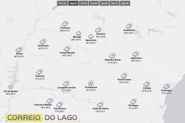 Apesar da chuva, as temperaturas permanecem elevadas, chegando perto dos 30°C no Oeste do Estado, especialmente em cidades como Altônia, Santa Helena e Foz do Iguaçu. Já no Leste, os valores são mais amenos, em torno dos 22°C.
