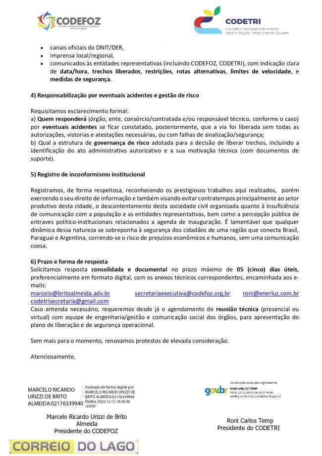 “É dever do poder público fornecer à sociedade informações de interesse coletivo, assim como é sua obrigação garantir a segurança das pessoas. Estamos pedindo transparência nos procedimentos e decisões”, frisa o presidente do Codefoz, Marcelo Brito. “Foz do Iguaçu e a região trinacional são muito maiores do que disputas políticas ou eleitorais. Exigimos respeito”, assevera.