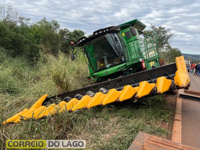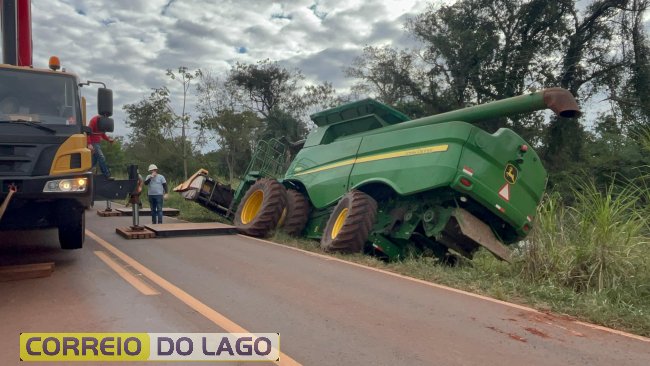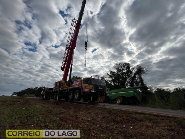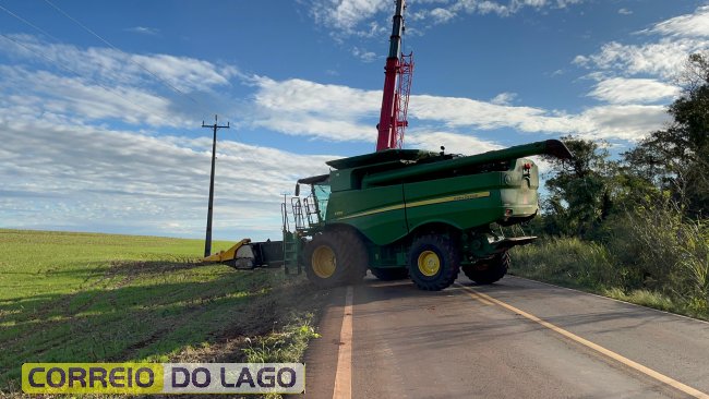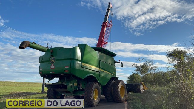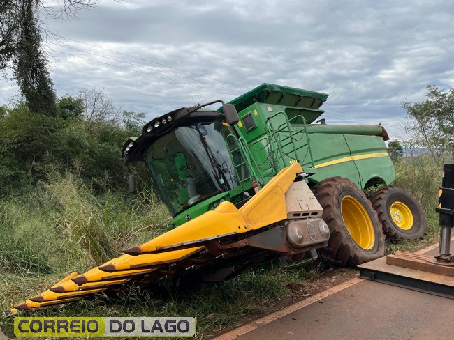 Uma colheitadeira que ficou em situação de risco de capotamento às margens da PR-488, no trecho entre Santa Helena e Diamante d’Oeste, foi retirada com sucesso na tarde desta quarta-feira (25).