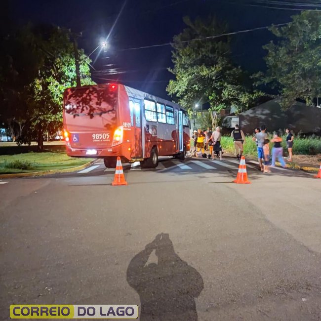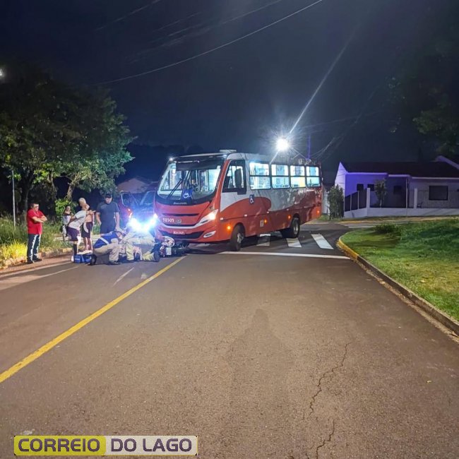 Uma batida entre um ônibus do transporte coletivo e uma moto deixou uma mulher ferida na noite de terça-feira (27), em Toledo. O acidente aconteceu no cruzamento da Rua Pastor Ulve com a Rua Romano Fidelski, no bairro Jardim Pancira.
