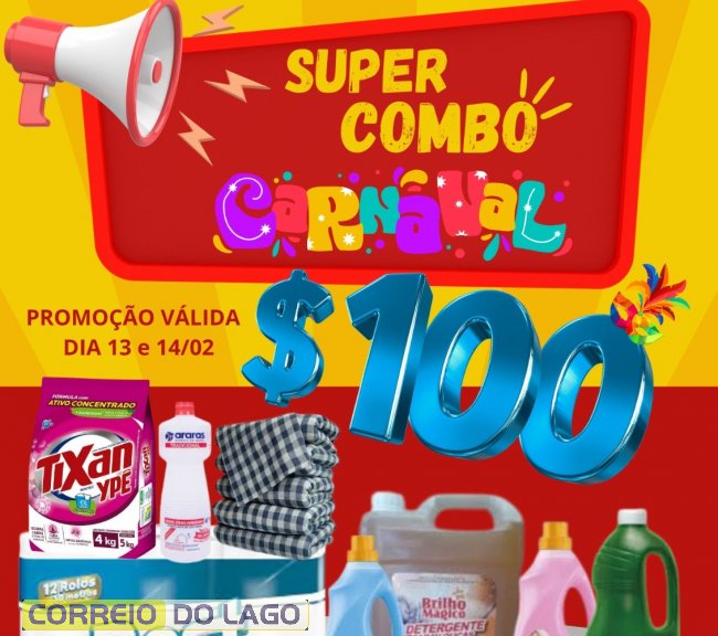 A Detergentes Costa Oeste prepara um Super Combo de Carnaval com produtos essenciais para a limpeza da casa por R$ 100 no pagamento em dinheiro ou Pix. O combo inclui papel higiênico com 12 rolos, água sanitária 2 litros, dois amaciantes 2 litros, sabão em pó 4 kg, detergente 5 litros, álcool líquido 1 litro e pano de limpeza 90x65. No cartão de débito ou crédito em até duas vezes, o valor é de R$ 110.