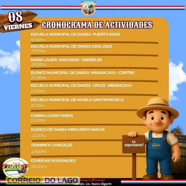 Começou na noite de quarta-feira (06) e seguirá até domingo (10), em Mbaracayú, município do Paraguai na região do lago de Itaipu, em frente a Santa Helena, no Paraná, a 17ª Festa do Colono, organizada pela comunidade de General Díaz (km 42).