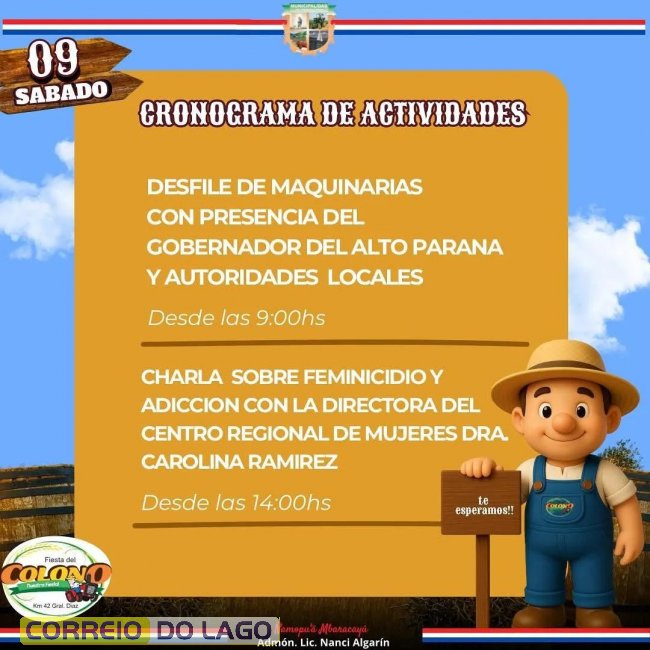 Já no sábado (9), continua a exposição e tem o tradicional desfile de maquinários com a presença do governador de Alto Paraná, César Landy Torres, além de autoridades locais. Isso já a partir das 9h. Às 14h tem palestra sobre feminicídio e drogadição.