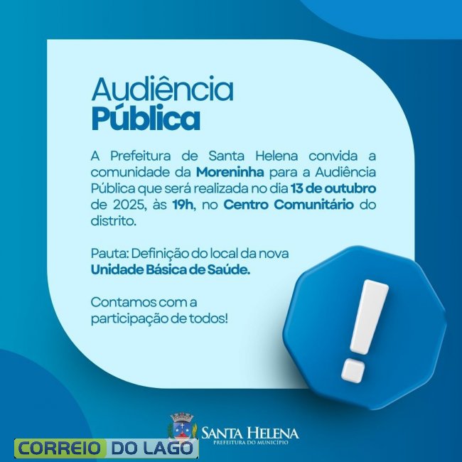 A Prefeitura de Santa Helena realiza nesta segunda-feira, 13 de outubro, uma Audiência Pública com a comunidade da Moreninha, às 19h, no Centro Comunitário do distrito.