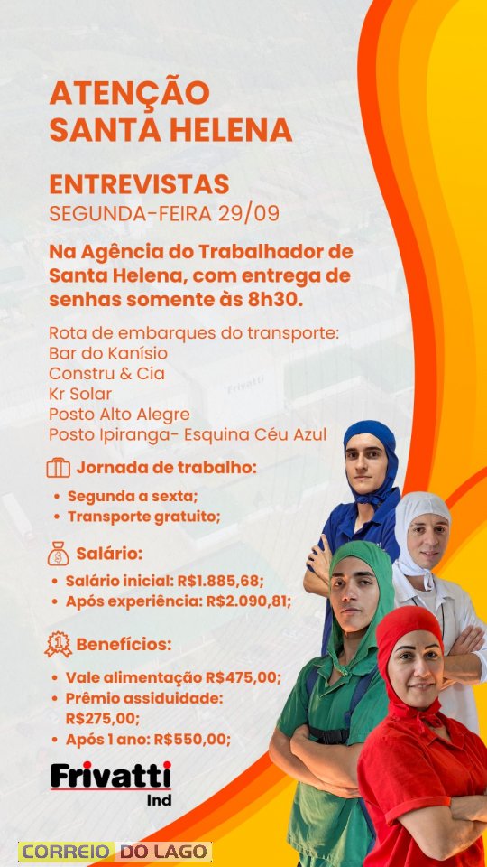 MAIOR DE 18 ANOS, NÃO NECESSITA EXPERIÊNCIA (ENTREVISTAS NA AGÊNCIA DO TRABALHADOR DE SANTA HELENA DIA 29/09/2025 A PARTIR DAS 08H30).