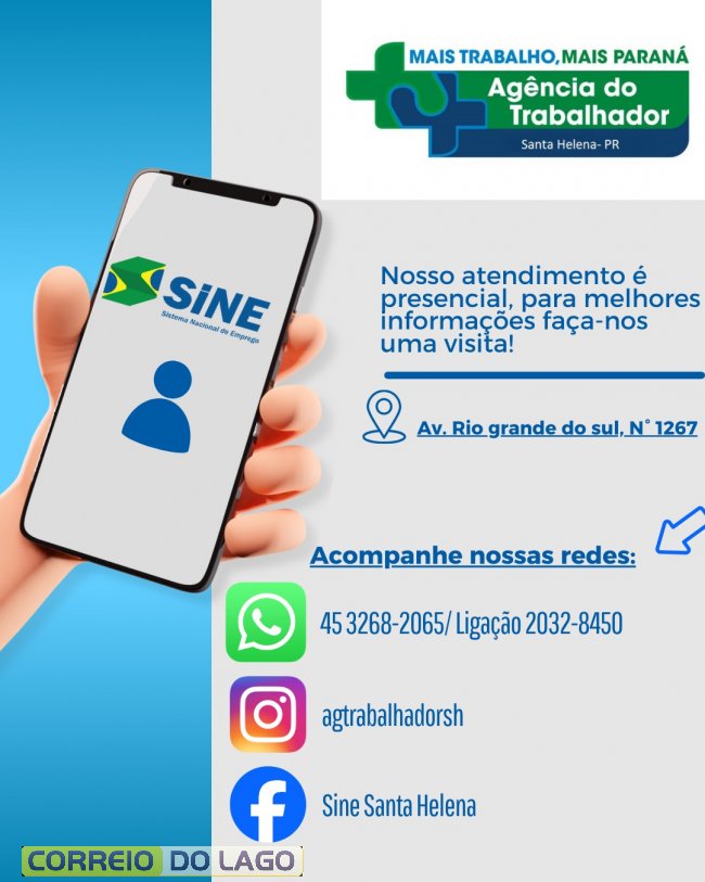 Informações e cadastro, dirija-se até a Agência do Trabalhador localizada na Avenida Rio Grande do Sul, nº 1267, centro de Santa Helena.