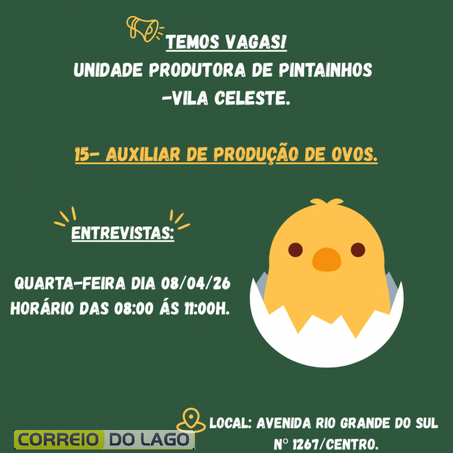15- AUXILIAR DE PRODUÇÃO DE OVOS MAIOR DE 18 ANOS, NÃO NECESSITA EXPERIÊNCIA (ENTREVISTAS NA AGÊNCIA DO TRABALHADOR DIA 08/04/2026 QUARTA-FEIRA DAS 08:00 ÀS 11:00 HORAS).